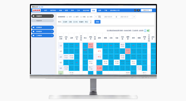 電腦統(tǒng)計(jì)查看考勤記錄,根據(jù)不同顏色判斷考勤情況。